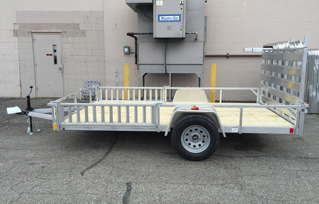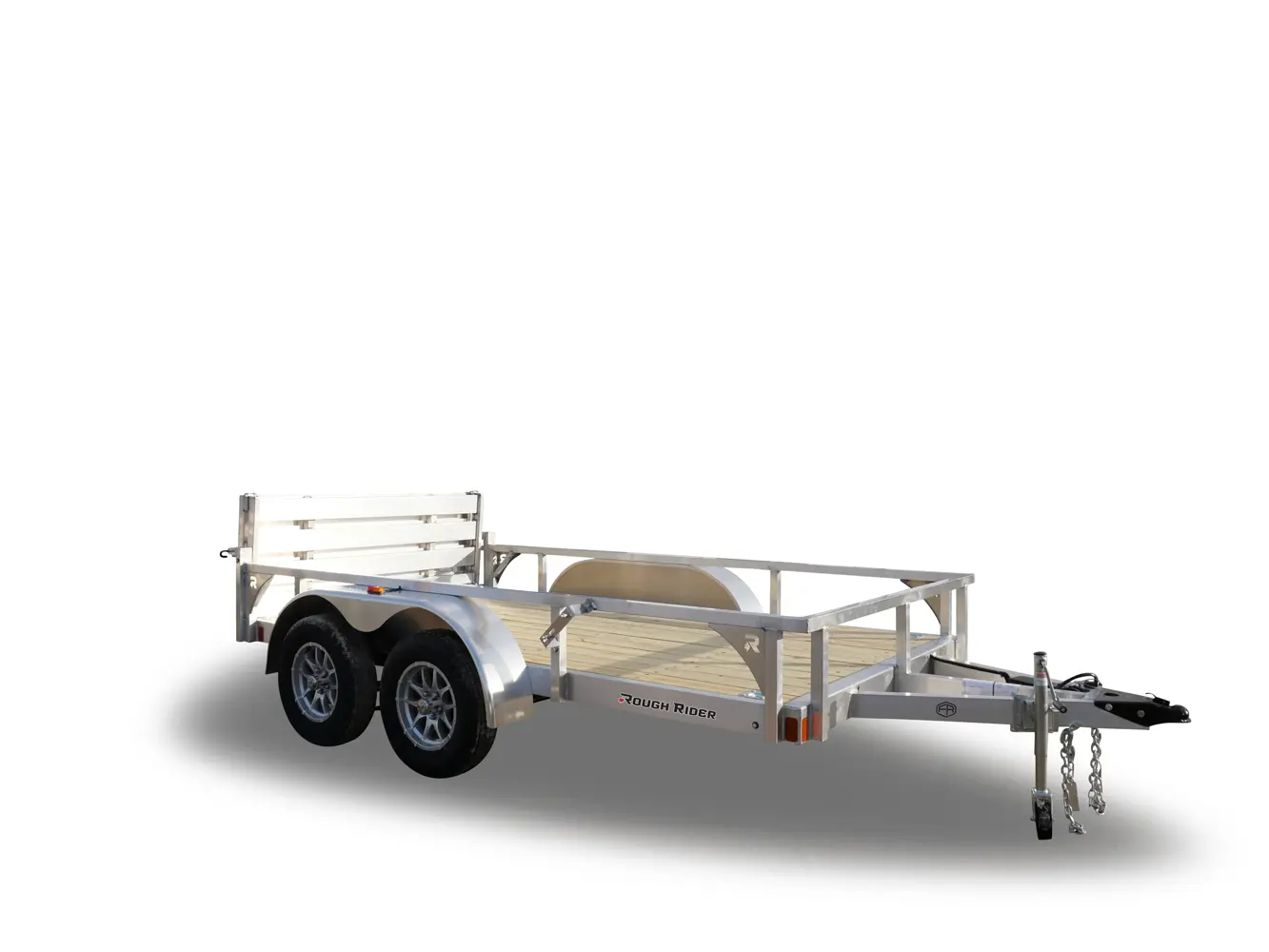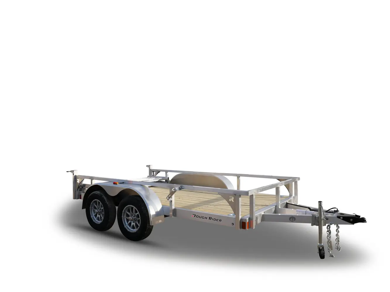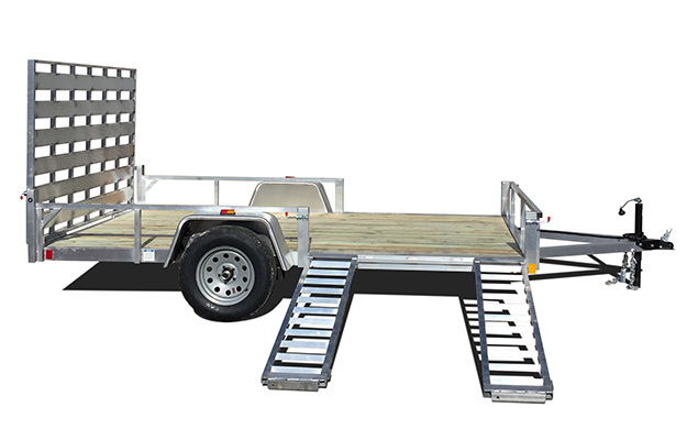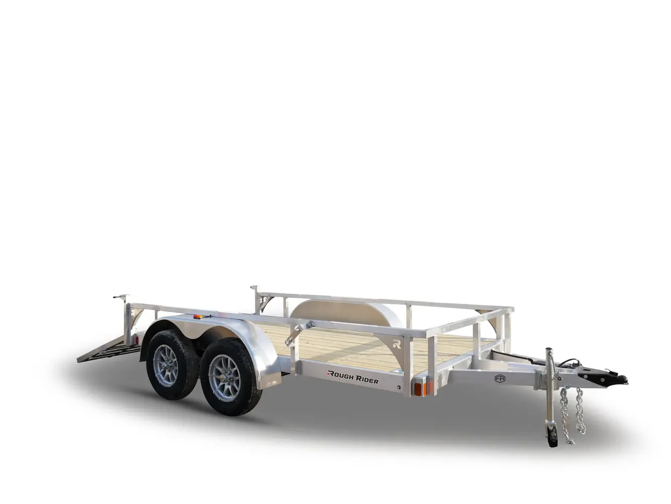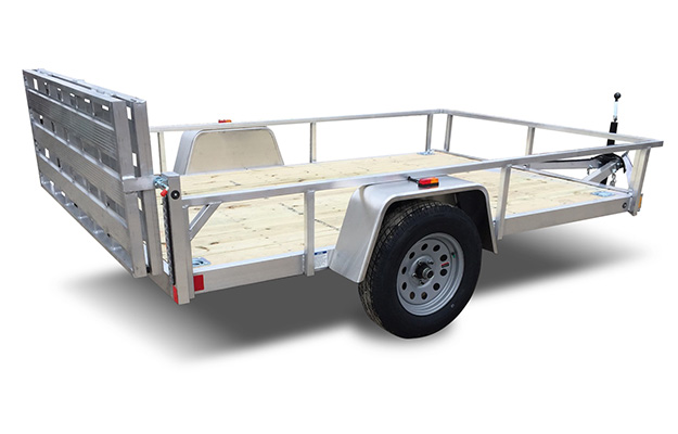 Rance Aluminum Rough Rider Utility Trailers feature aluminum tube frame and side rails, 5/4" x 6" treated deck board floors, 5,000 lb. d-ring tie downs, LED clearance and tail lights, and 3,500 lb. spring axle. (Photos may show some optional equipment.)